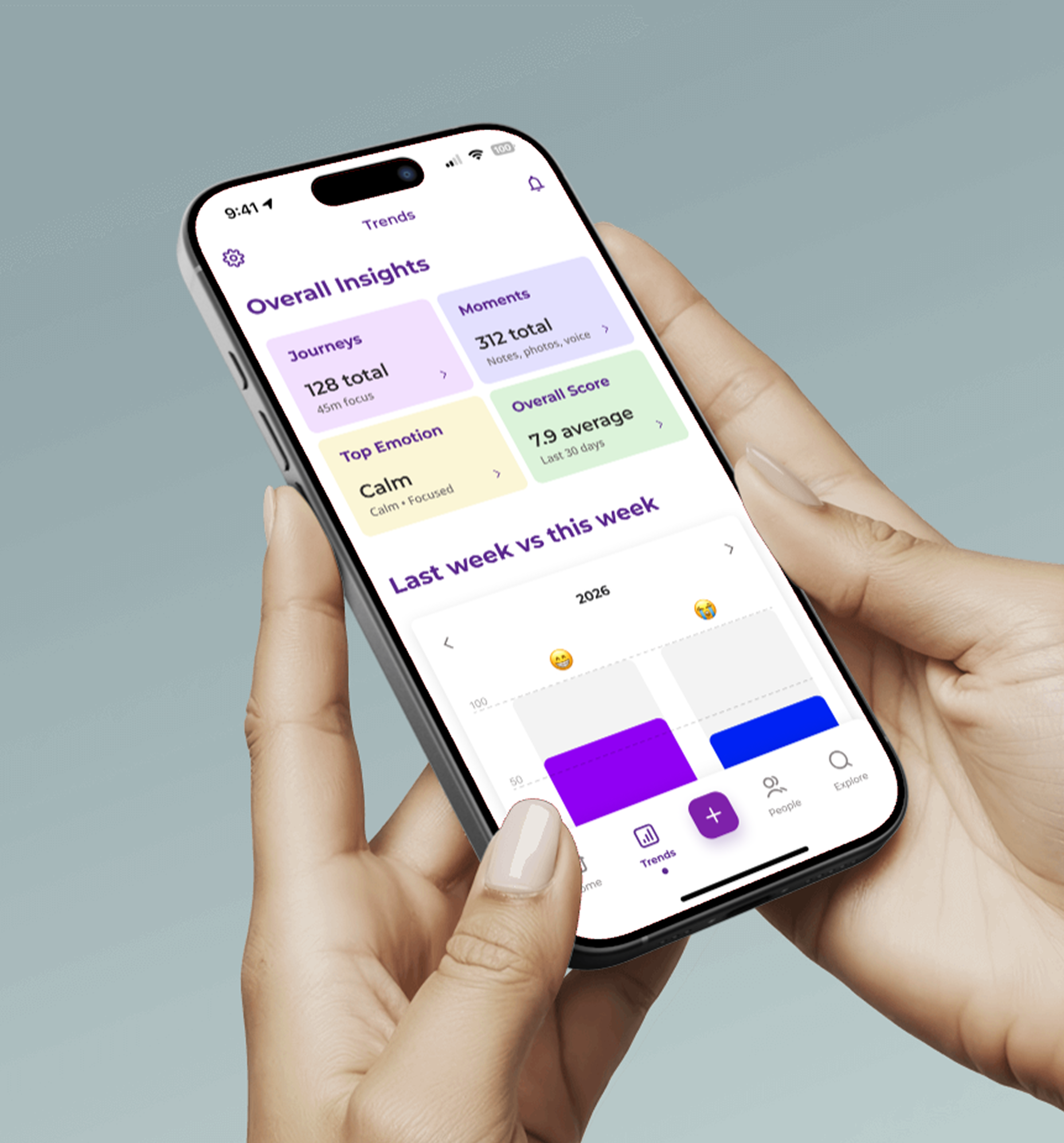 MUUD Notes makes capturing feelings simple. Start with a quick reaction, then expand into a deeper emotional signal. Over time, these signals become valuable data that helps you understand your patterns and receive personalized insights.
